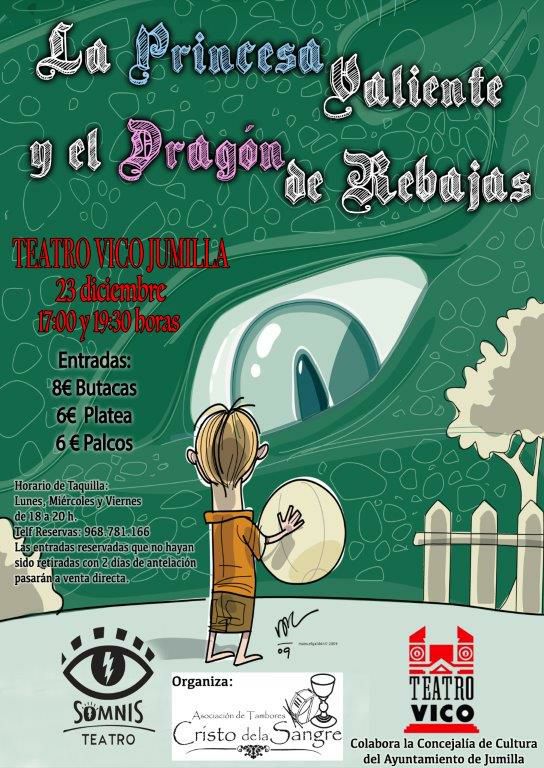 La Asociación de Tambores Cristo de la Sangre ha preparado un espectáculo infantil para los pequeños y no tan pequeños de la casa. Se trata de ‘La princesa valiente y el dragón de rebajas’ y se representará el sábado 23 de diciembre, en el Teatro Vico, en dos pases, a las 17:00 y a las 19:30 horas
