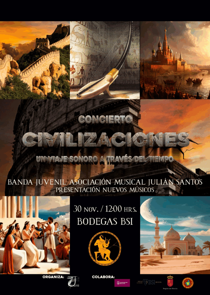 La banda juvenil de la Asociación Musical Julián Santos celebra Santa Cecilia con el concierto titulado: “Civilizaciones: Un viaje sonoro a través del tiempo”.