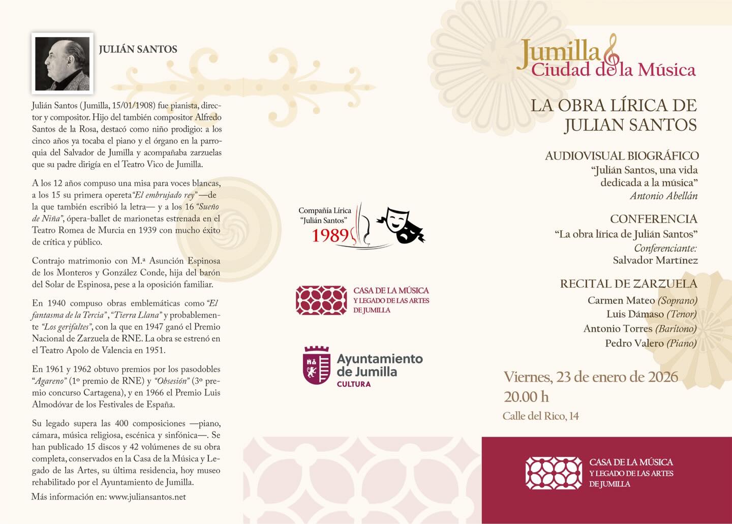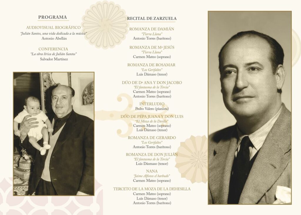 En el acto de presentación se proyectará un audiovisual biográfico titulado “Julián Santos, una vida dedicada a la música”, de la mano de Antonio Abellán, y seguidamente Salvador Martínez ofrecerá la conferencia “La obra lírica de Julián Santos”. Se concluirá con un recital de zarzuela interpretado por la soprano Carmen Mateo, el tenor Luis Dámaso, el barítono Antonio Torres y el pianista Pedro Valero.
