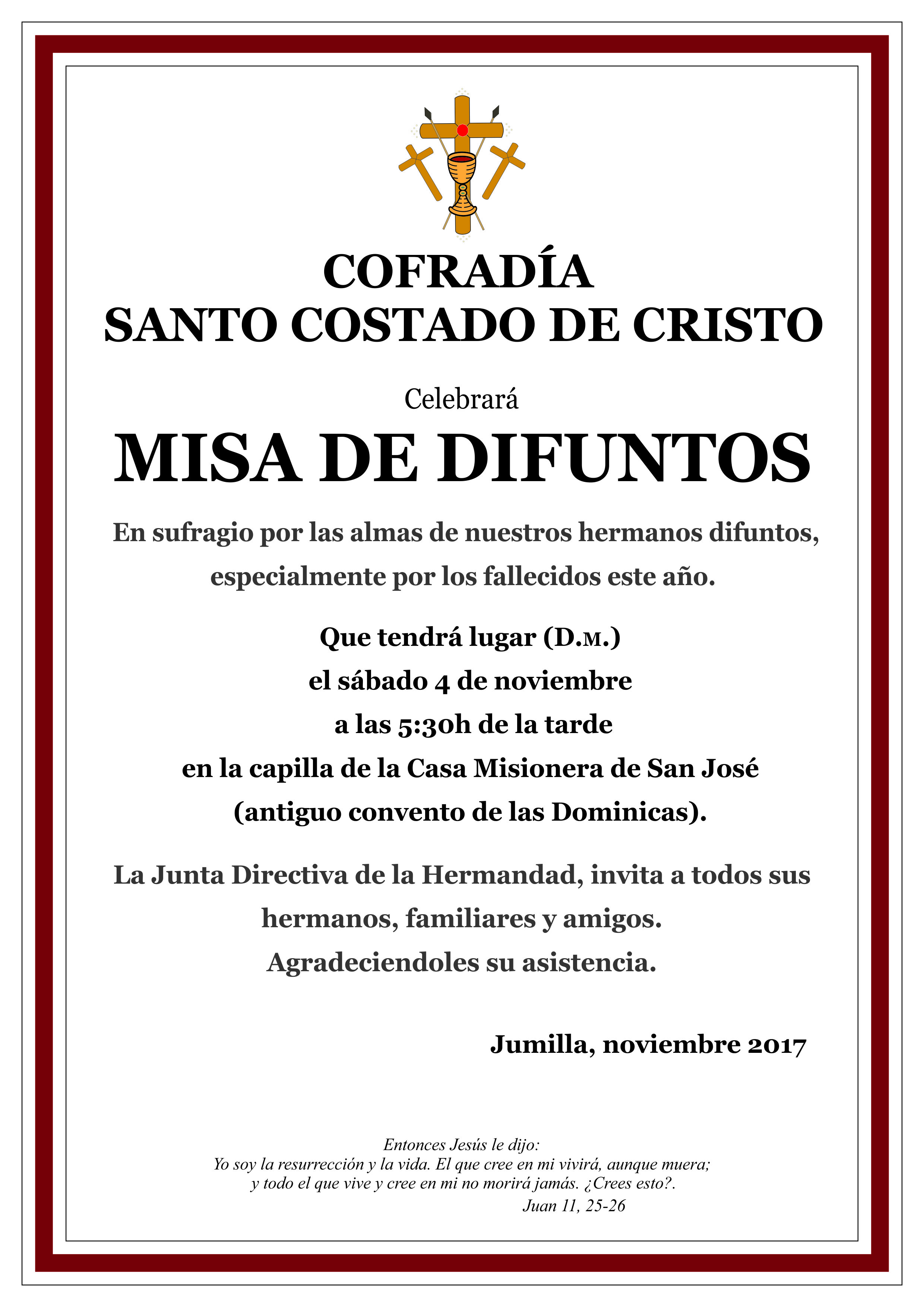En sufragio por las almas de los hermanos difuntos y especialmente por los fallecidos de este año, la Cofradía del Santo Costado de Cristo celebra este sábado una misa.