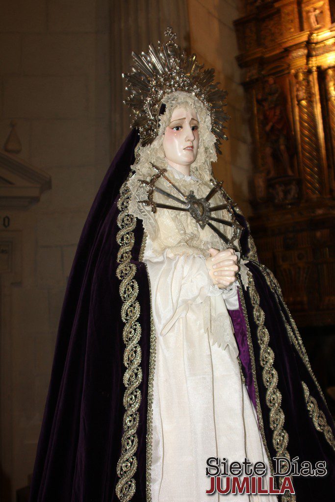 La imagen, que hasta ahora no ha estado al culto público, sino que era propiedad de familias particulares, es una talla devocional de la Santísima Virgen de los Dolores, de las llamadas de candelero, esculpida en madera policromada, de vestir, con diadema rematada en Cruz y corazón atravesado por un puñal. Tiene los ojos de cristal y brazos articulados, mide 160 cm, y va sobre una peana roja adamascada y dorada de 19 cm. Su autor es anónimo y está datada en el siglo XIX.