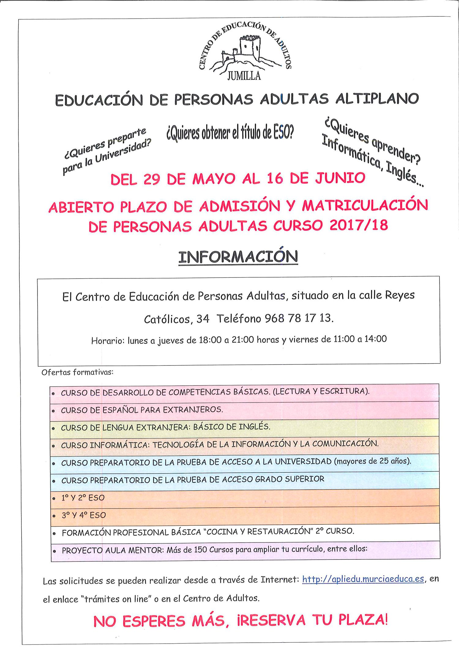El Centro de Educación de Adultos de Jumilla informa a los interesados que se ha abierto el plazo de admisión y matriculación para el curso 2017/2018 hasta el 16 de junio.
