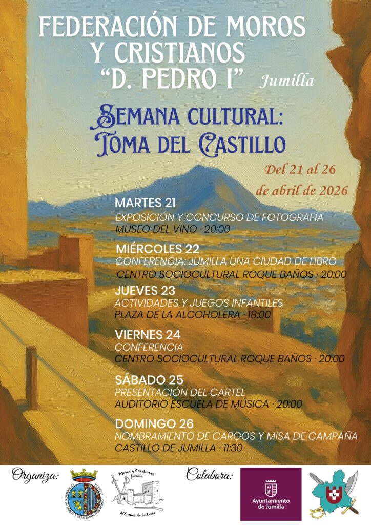 Con esta actividad, la federación ha arrancado su semana cultural ‘Toma del Castillo’. El programa continúa esta tarde, en la Plaza de la Alcoholera con actividades y juegos infantiles y mañana viernes, Emiliano Hernández protagonizará una conferencia sobre ‘Castillo de Jumilla. Arquitectura y restauración’. La cita es a las 20:00 en el Roque Baños.