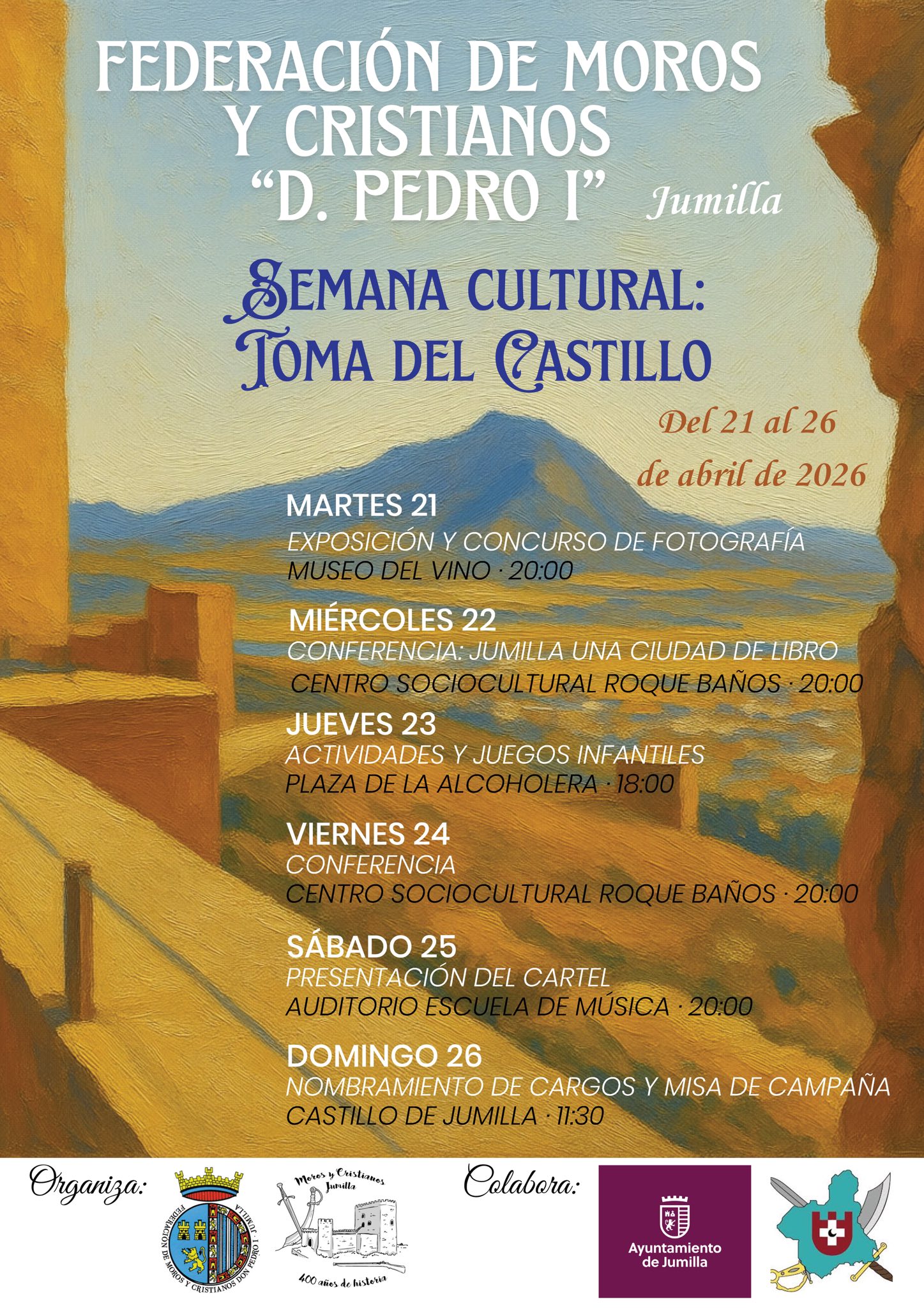 El sábado será presentado el cartel de las fiestas, a las 20:00 horas en el Auditorio y, además, Juan Antonio Soler hará un repaso de los 40 años de las fiestas. Ya el domingo, en el Castillo se presentarán los cargos festeros 2026 y el pregonero. El acto comenzará a las 11:30, habrá misa y después, degustación de vinos de J. García Carrión y un picoteo. Se establece una colaboración de 10 euros y habrá servicio de autobús a partir de las 10:30 desde Campos de Jumilla.