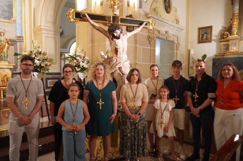 Tras la misa, se realizó el solemne besapié y a continuación, el párroco, Valeriano Martínez, y la presidenta, Mari Carmen Valero, hicieron entrega de los escapularios a los diez nuevos hermanos que se incorporan al colectivo semanasantero.