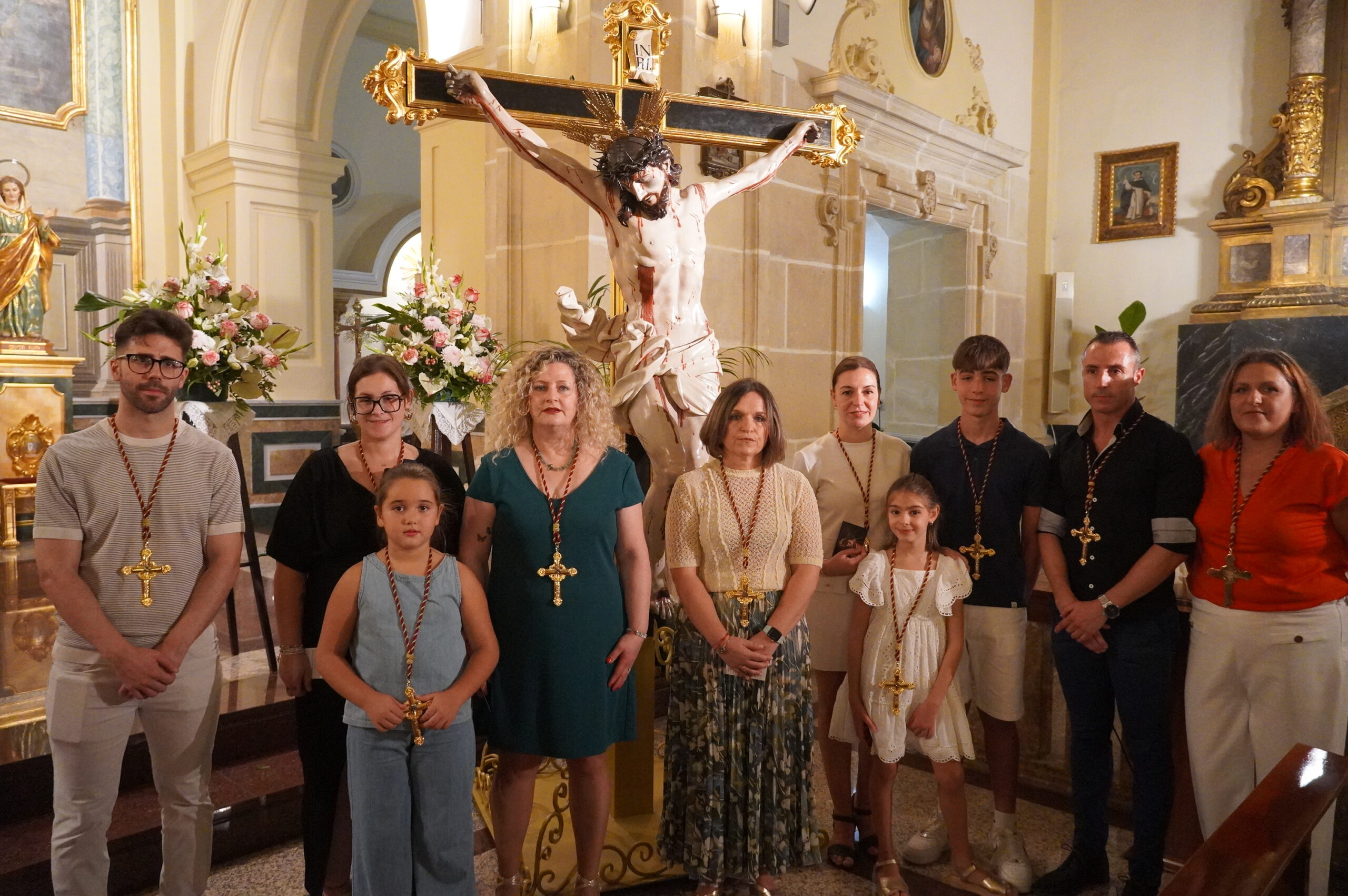 Tras la misa, se realizó el solemne besapié y a continuación, el párroco, Valeriano Martínez, y la presidenta, Mari Carmen Valero, hicieron entrega de los escapularios a los diez nuevos hermanos que se incorporan al colectivo semanasantero.