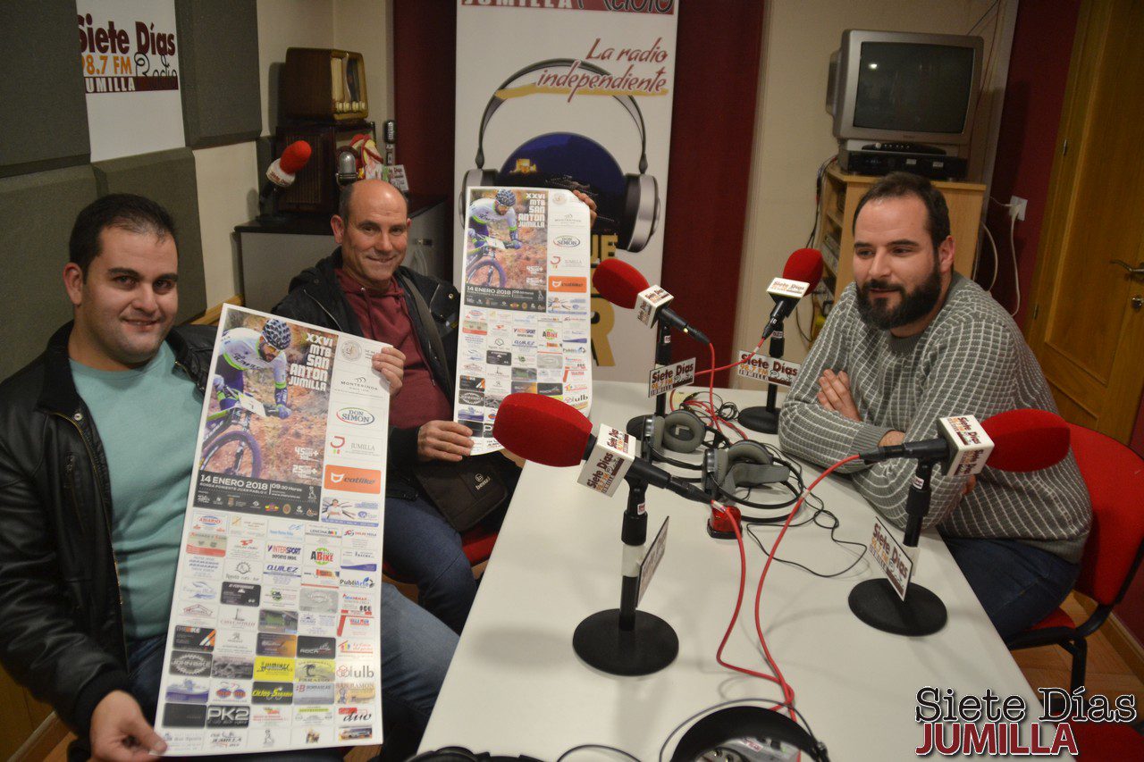 La Mountainbike San Antón celebrará el 14 de enero de 2018 su 26ª edición, y para contar todos los detalles el pasado jueves estuvieron en el estudio central de Siete Días Radio Juan García, vicepresidente del Club Jumilla BTT; y Miguel Pérez, presidente de la Asociación de Vecinos del Barrio de San Antón.
