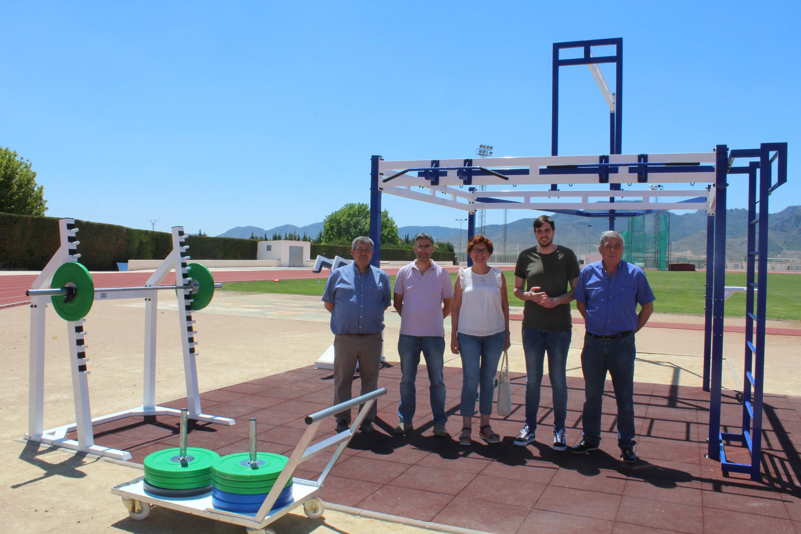 La alcaldesa de Jumilla, Juana Guardiola, y el concejal de Deportes, Juan Manuel García, han presentado esta mañana la multiestación deportiva de aparatos gimnásticos de exterior instalada en el Polideportivo La Hoya, que permitirá la preparación física de los deportistas en gran cantidad de modalidades. Han estado acompañados por el concejal de Servicios, Francisco González, el jefe del área de Deportes, Francisco Crespo, y del secretario del Athletic Club Vinos de Jumilla, Juan Mateo.