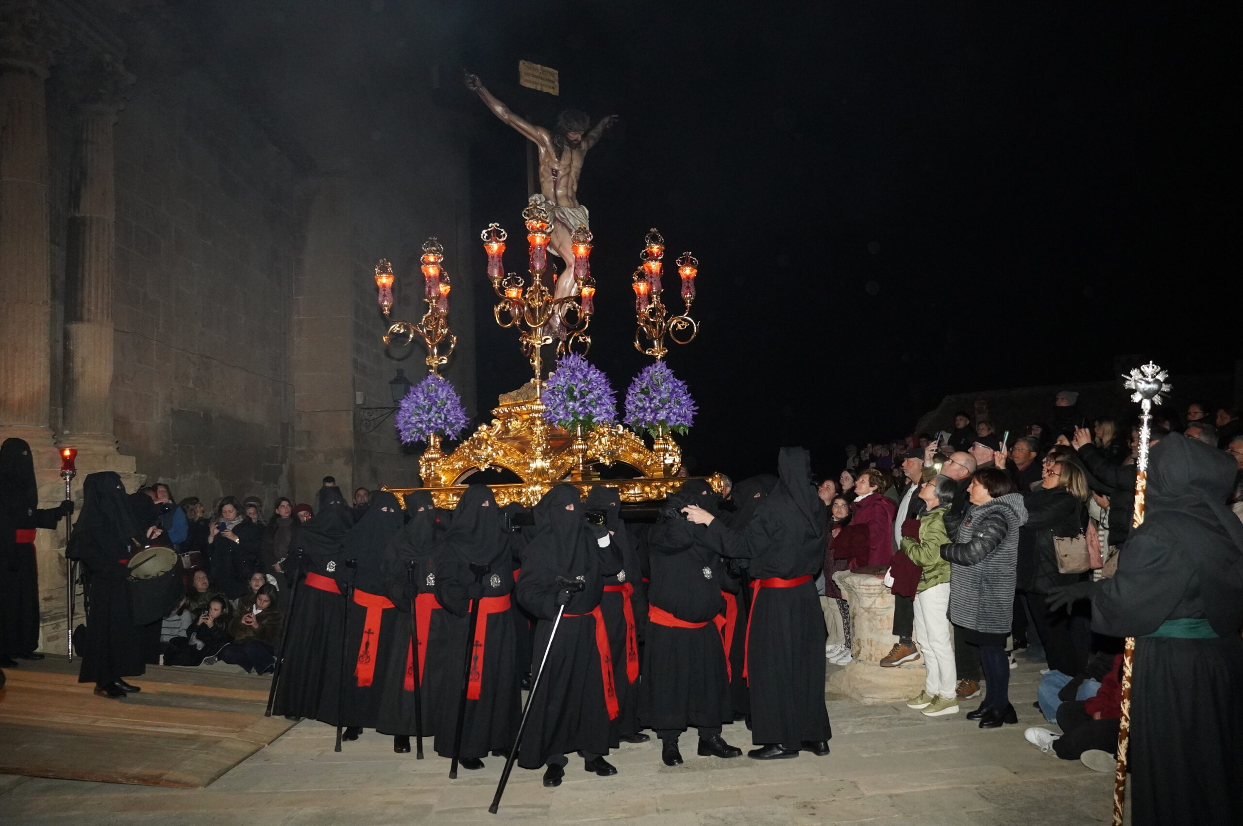 Una primaveral noche rodeó la procesión de Martes Santo, que a la media noche iluminó las estrechas calles del Casco Antiguo bajo la imponente banda sonora del silencio, tan solo roto por el crepitar de los sarmientos de las hogueras, el chirriar de las cadenas y las pisadas de los sufridos penitentes cargados con cruces y velas.