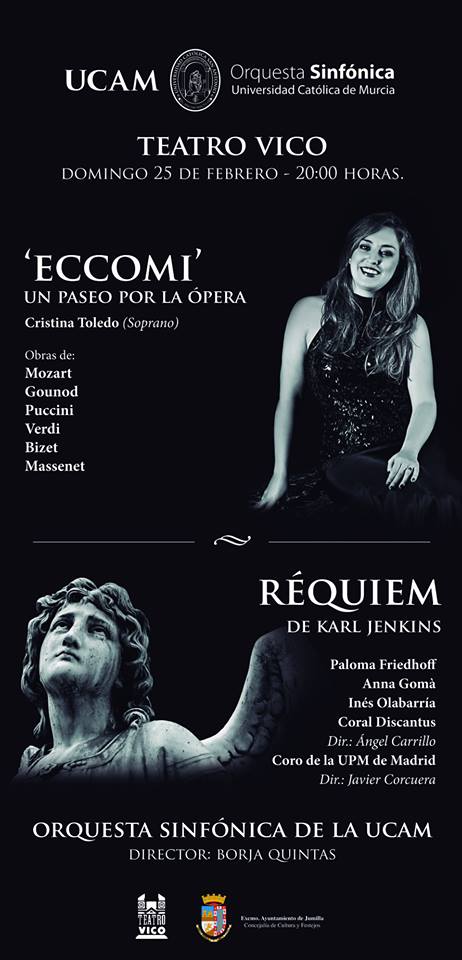 En la segunda parte, la obra protagonista será el Réquiem del galés Karl Jenkins, interpretada por la Orquesta Sinfónica de la UCAM y la Coral Discantus, que contará como solistas con Paloma Friedhoff (soprano), Anna Goma (mezzosoprano) e Inés Olabarría (contralto).