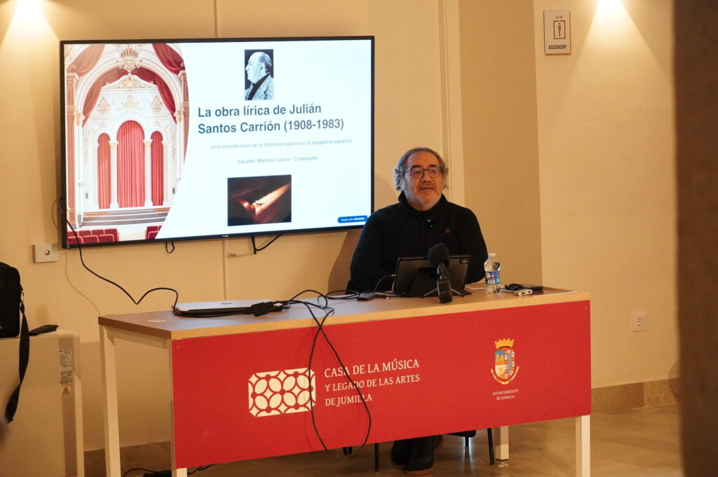 El compositor Salvador Martínez fue el encargado de disertar ante un completo aforo en la Casa de la Música, de la obra lírica del maestro Julián Santos, desde 1908 hasta 1983. Ofreció un recorrido por la figura del Hijo Predilecto de Jumilla, calificándolo como uno de los grandes guardianes de la zarzuela en tiempos difíciles, dibujando el perfil de un compositor con sólida formación académica que, desde la posguerra y lejos de los grandes teatros, mantuvo viva una tradición que se apagaba.