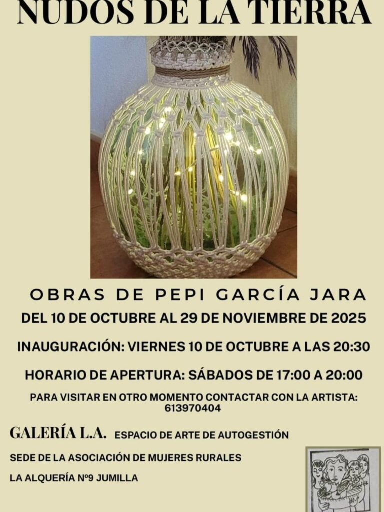 La inauguración de Nudos de la tierra, tendrá lugar manaña a las 20.30 horas, y la apertura de la muestra para su visita será los sábados de 17.00 a 20.00 horas hasta el 29 de noviembre, y bajo cita previa con la artesana en el teléfono 613970404.