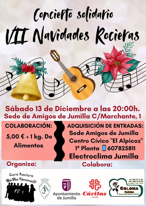 Las Navidades Rocieras se celebran este sábado 13 de diciembre a las 20:00 horas, en la Sede de Amigos de Jumilla, y se espera reunir a numerosos asistentes dispuestos a disfrutar del ambiente rociero y a sumar un gesto solidario en vísperas de la Navidad.