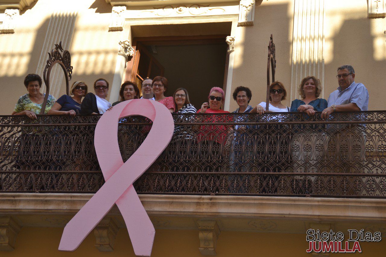 La alcaldesa de Jumilla, Juana Guardiola, y la presidenta de la AECC en Jumilla, María Josefa Calvo, acompañadas de varios concejales y componentes de la asociación, han colgado esta mañana en el balcón del Ayuntamiento el lazo rosa que conmemora y da inicio a la semana de actividades por el Día Internacional contra el Cáncer de Mama que han organizado la Concejalía de Salubridad Pública y la Asociación Española Contra el Cáncer. La fachada del consistorio estará, además, iluminada durante toda la semana.