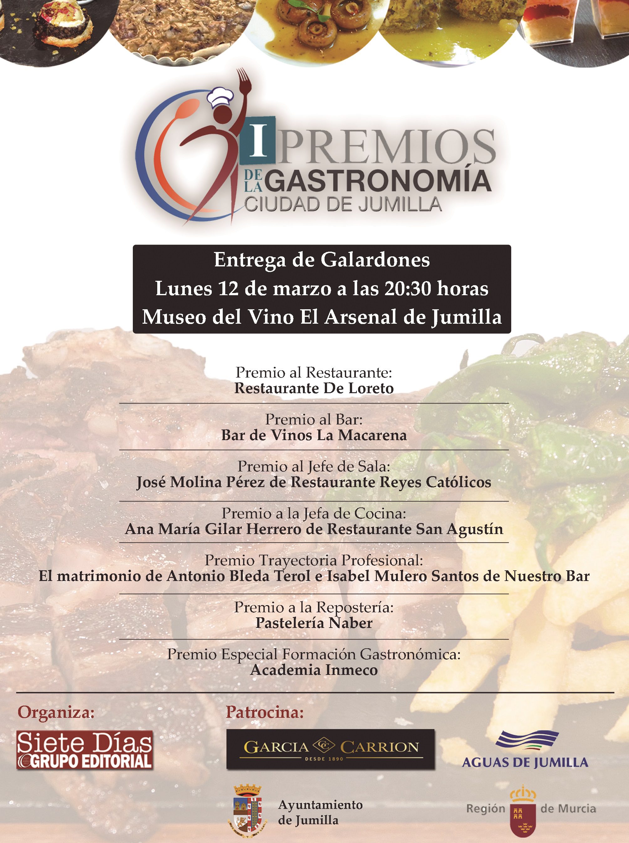 Los I Premios de la Gastronomía Ciudad de Jumilla, nacen de la inquietud del Grupo de Comunicación Siete Días Jumilla, para reconocer no ya a los mejores restaurantes y bares además de gerentes, camareros y cocineros sino a los que han estado siempre al frente de este tipo de negocios, a los que están, y a los que están tratando de buscarse un hueco en el mundo de la restauración y la gastronomía.