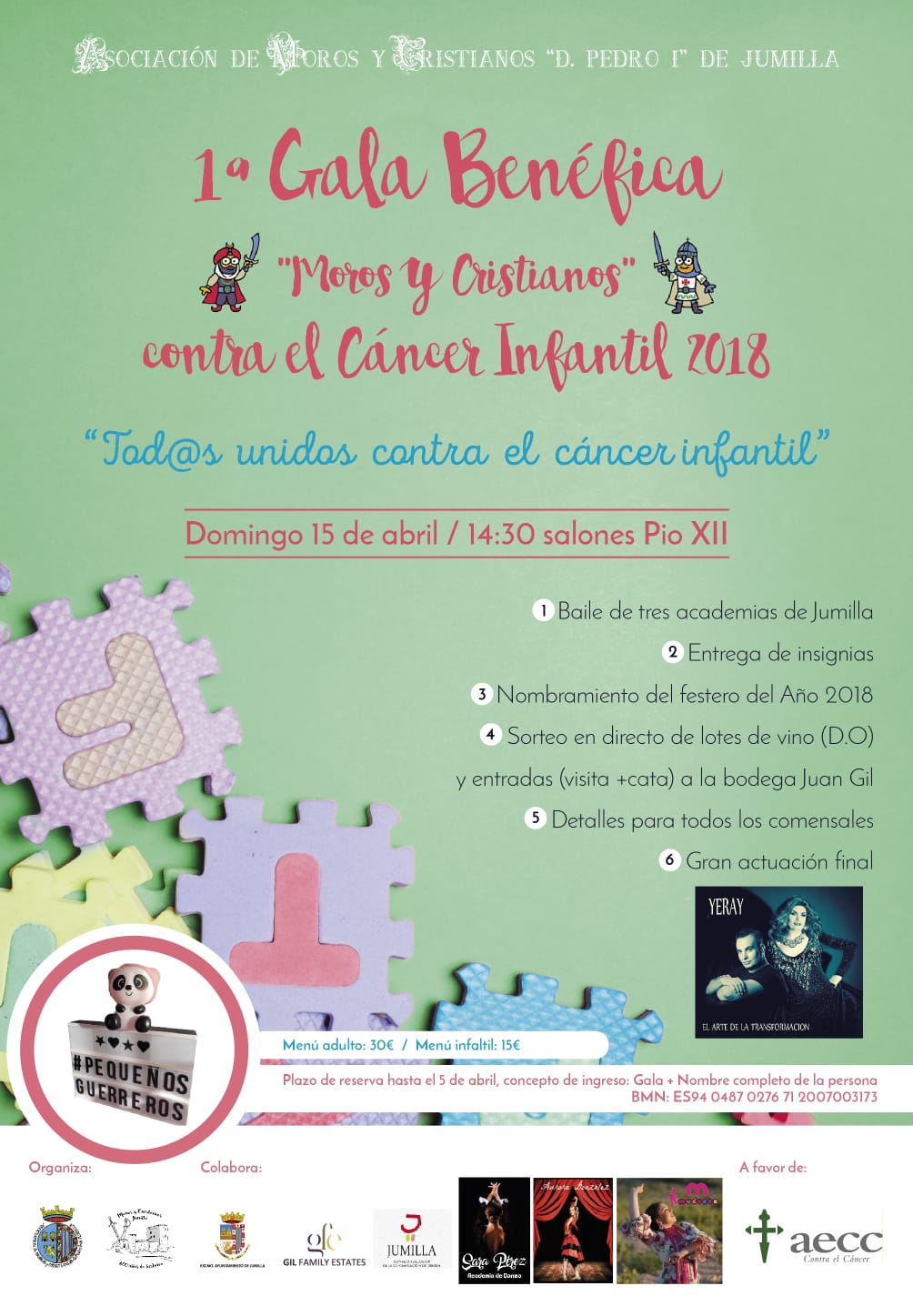 El acto comenzará con  las actuaciones de las academias  de Sara Pérez, Aurora González y la Asociación Cultural Muévete, y al finalizar la actuación de Yeray. Seguidamente se procederá a la entrega de insignias de la Asociación y se desvelará el nombre del Festero del Año 2018. Se sortearán lotes de vino de la D.O. Jumilla, así como catas y visitas guiadas a Bodegas Juan Gil. Para más información pueden ponerse en contacto con el teléfono  634 40 17 44.