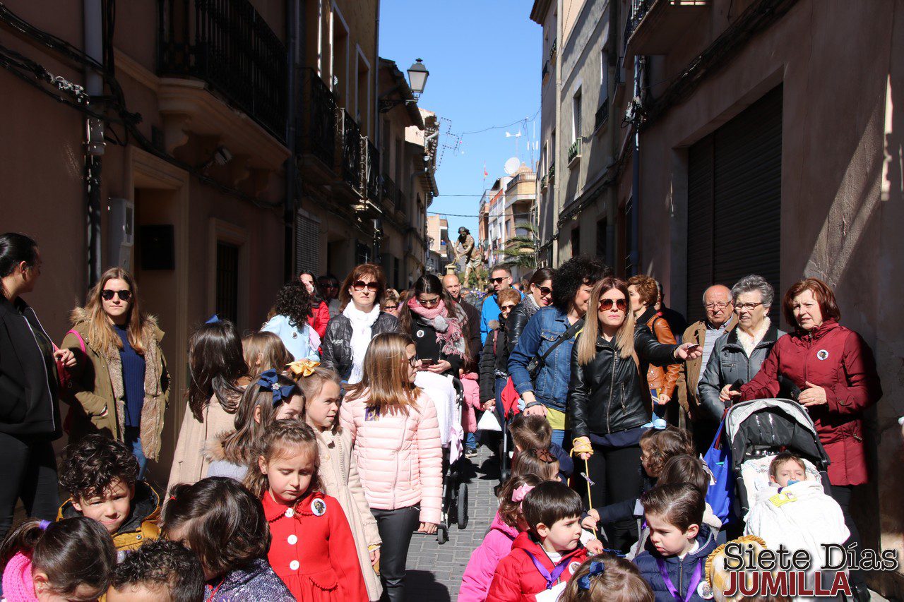 Multitud de niños, sobre todo, acudieron como cada año al traslado que de la imagen del Cristo se realiza cada Lunes Santo desde la iglesia de Santiago hasta su sede, en Barón del Solar, donde se deposita para situarlo en su trono y se prepara para participar en las procesiones de La Amargura y del Calvario. Un traslado especial con los niños de Jumilla como acompañantes.