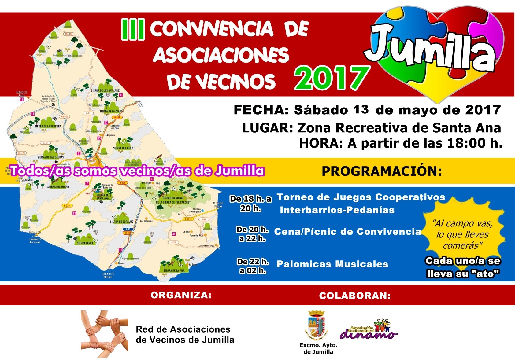 El sábado 13 de mayo, o sábado de Romería va a tener lugar en Santa Ana, el III Encuentro de Asociaciones de Vecinos de Jumilla, organizado por la Red de Asociaciones de Vecinos de Jumilla, en colaboración con el Ayuntamiento y la Asociación Sociocultural Dinamo.