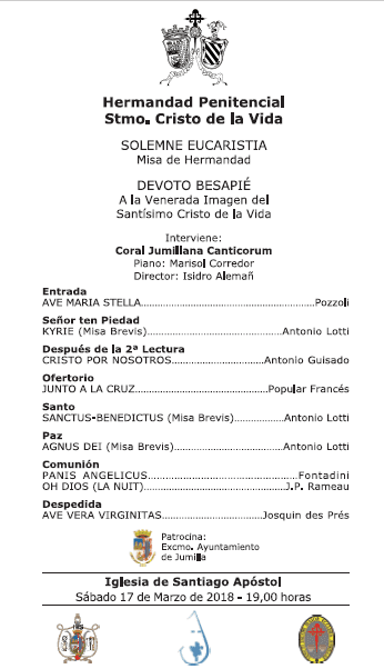 La Eucarística estará oficiada por el consiliario de la hermandad, y párroco de la Iglesia Jorge Oliva Martínez, interviniendo durante el transcurso de la misma la Coral Canticorum de Jumilla. Al finalizar se procederá a la imposición de medallas a hermanos y hermanas de esta entidad pasionaria de Jumilla.