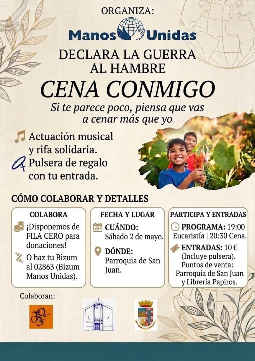 La delegada de Manos Unidas en Jumilla, Cuquen Bacigalupe, ha organizado el evento solidario Cena Conmigo, que antes se conocía como ‘la cena del hambre’. Se llevará a cabo este sábado 2 de mayo a las 20.30 horas en el patio de la iglesia de San Juan, tras la misa de las 19.00 h.