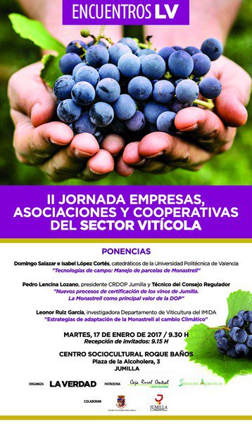 Dentro de los encuentros que organiza el diario regional La Verdad, el martes 17 de enero, Jumilla acoge la II Jornada empresa, asociaciones y cooperativas del sector vitícola. Se va a desarrollar en el Centro Roque Baños de 9:30 a 12:30 y en ella participarán distintos profesionales de organismos, instituciones y administraciones. La jornada está patrocinada por Servicios Agrícolas de Caja Rural Central y colaboran el Ayuntamiento de Jumilla y el Consejo Regulador de la DOP.