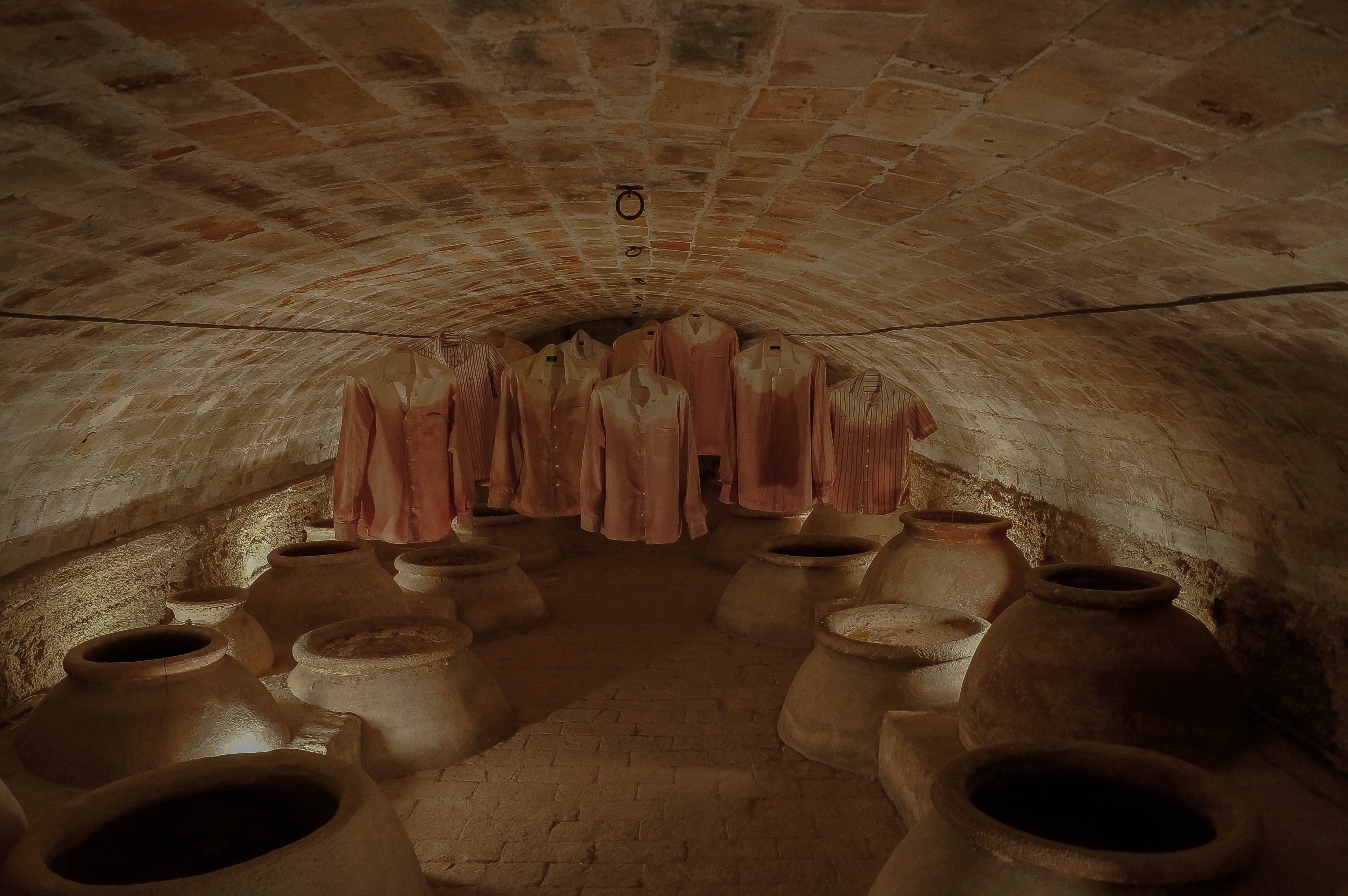 Se trata de “Esencias y sensaciones de la oxidación del vino”, una instalación escultórica que se podrá visitar en la Bodega de la Casa Pintada hasta el próximo 17 de junio y en la que se pueden observar las camisas teñidas con los pigmentos que deja la uva monastrell y que cuidadosamente ha llevado a cabo la propia abuela del artista, la Dama Juana, a la que el pintor ya dedicó un vino y etiquetado especial, como parte de su proyecto.