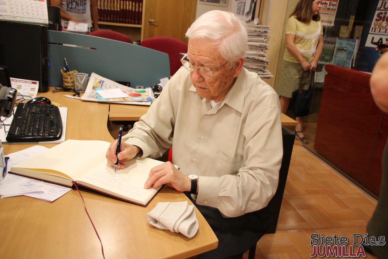 En la ciudad ha llevado a cabo distintas actividades, acompañado siempre por su colega y amigo, el también jumillano Guzmán Ortuño Pacheco, y una de ellas ha sido, la visita por primera vez, a la redacción de Siete Días Jumilla, algo que para este equipo ha sido todo un privilegio. Mantuvo una amena charla con todos y firmó en el libro de honor de este grupo, integrándose así a las destacadas rubricas que han pasado, a lo largo de este tiempo, por la redacción.