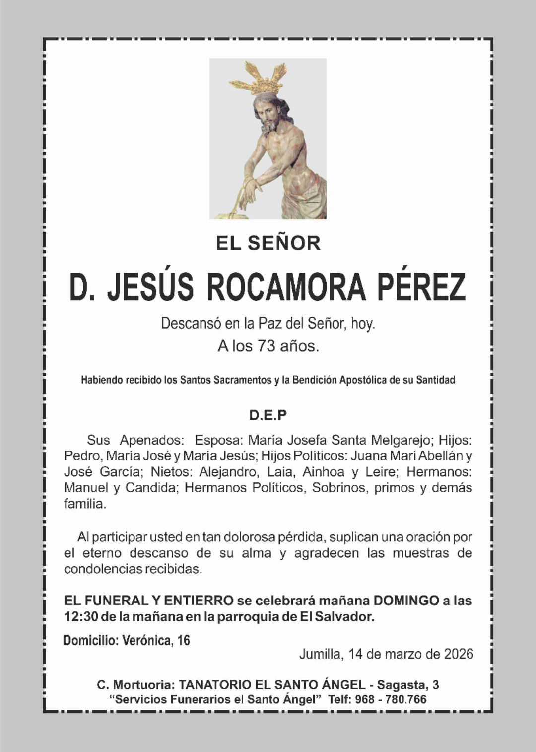 La misa funeral de D. Juan Martínez Pérez se oficiará el viernes 20 de marzo a las 19.30 horas en la iglesia de El Salvador.