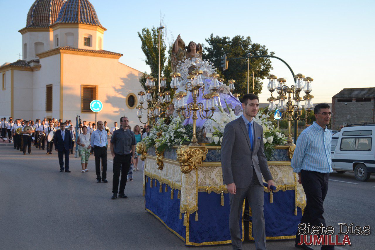 En el traslado de la Patrona hasta la iglesia del Salvador participaron los cargos festeros de la Asociación de Moros y Cristianos con los Capitanes Moro y Cristiano, Abanderada y Alcaidesa, la Federación de Peñas con los Vendimiadores Mayores e Infanitiles y el Mayordomo y Abanderada de la Virgen, el Club de Atletismo y Aspajunide. La presidenta de la Cofradía de la Virgen, Juan María Tomás García estuvo acompañada igualmente por las autoridades locales y religiosas, representantes de la Junta Central de Hermandades de Semana Santa y Cáritas.