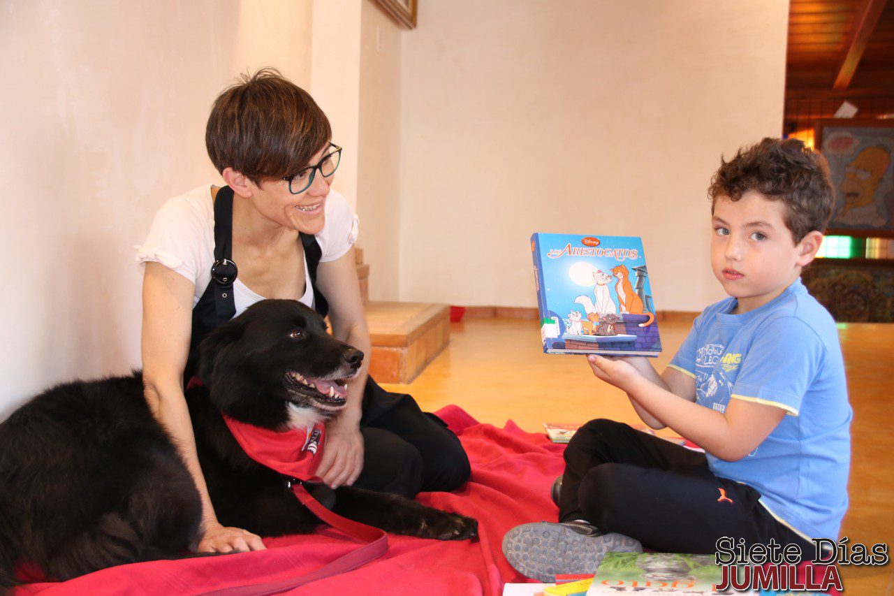 La Casa del Artesano acogió una nueva edición del programa Perros y letras, enfocado a mejorar las habilidades de lectura de los niños mediante la intervención de perros especialmente adiestrados para leer con ellos, en este caso Pani, el animal de la coordinadora del proyecto en la provincia de Murcia, la jumillana Ana María Molina.