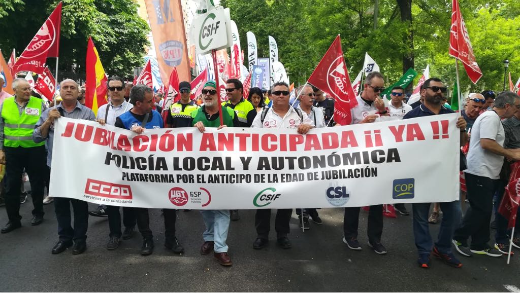Miles de policías municipales de toda España -unos 4.000 según la Delegación del Gobierno y unos 10.000 según los convocantes- se unieron a esta manifestación para exigir al presidente del Gobierno, Mariano Rajoy, la aprobación inmediata de la modificación legislativa para que puedan jubilarse a los 59 años.