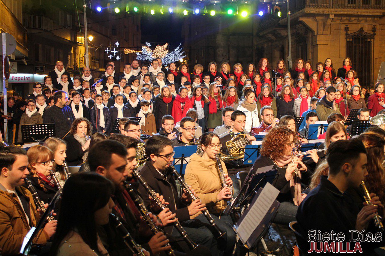 Ya por la tarde, en la puerta del Teatro Vico de la ciudad, se procedió al tradicional concierto de Navidad y encendido de luces, acto que corrió a cargo de la Banda de la Asociación Jumillana de Amigos de la Música y su coro de voces blancas, que interpretaron música navideña, bajo la dirección de Ángel Hernández Azorín.