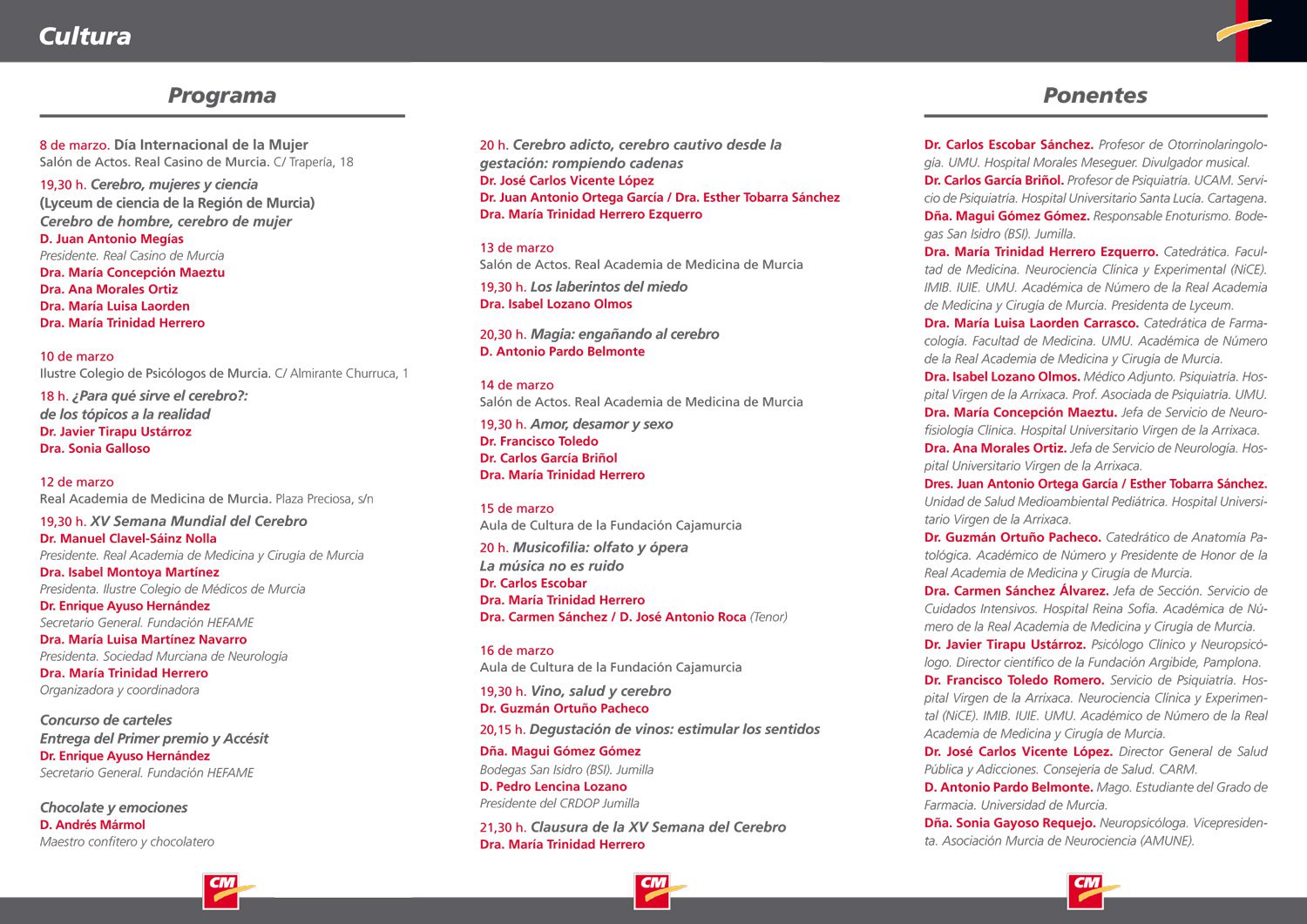 La intervención de los ponentes jumillanos se producirá justo antes del acto de clausura de la Semana Mundial del Cerebro, que correrá a cargo de María Trinidad Herrero, Catedrática de la Facultad de Medicina, experta en Neurociencia Clínica y Experimental y Académica de Número de la Real Academia de Medicina y Cirugía de Murcia.