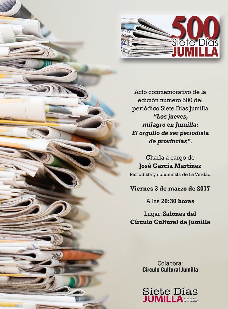 El próximo jueves 2 de marzo es una fecha destacada para el Grupo de Comunicación Siete Días Jumilla. Saldrá a la calle el ejemplar número 500, lo que representa casi 10 años de existencia del semanario, que fue continuidad del desaparecido El Faro de Jumilla que estuvo siete años en la calle.