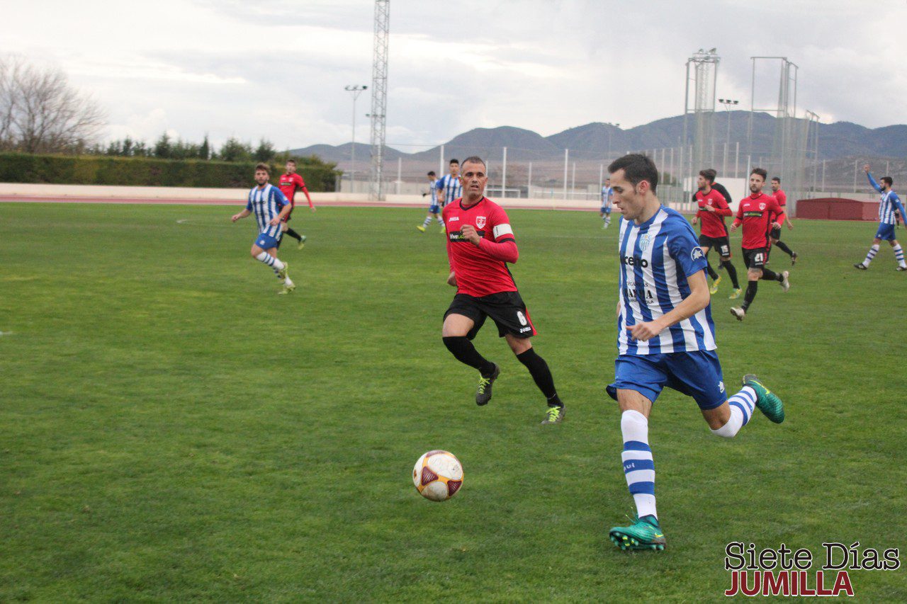 El Jumilla CD volvió a la senda del triunfo gracias a un partido en el que hizo muy buenas casi todas las ocasiones de las que dispuso. El partido comenzó frio, como frio era el tiempo que hizo la tarde de ayer en Jumilla, el juego discurrió en el centro del campo y el balón se disputó entre ambos conjuntos en un terreno de juego empapado, en el que la bola corrió rapidísimo y los resbalones se sucedieron los 90 minutos. Allá por el 24 llegó la primera ocasión para Jumilla desde el córner, en el que un buen remate de cabeza de Chino, en el que la pelota resbaló entre las manos de Bastida significó el 1-0.
