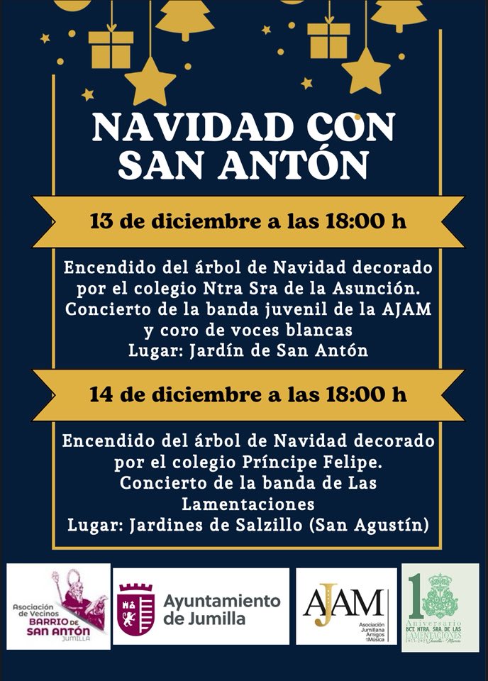 De esta manera, en primer lugar, este sábado 13 de diciembre a las 18.00 horas, tendrá lugar el encendido del árbol de Navidad ubicado en el barrio de San Antón, y habrá un concierto de la banda juvenil de la Asociación de Amigos de Jumilla.