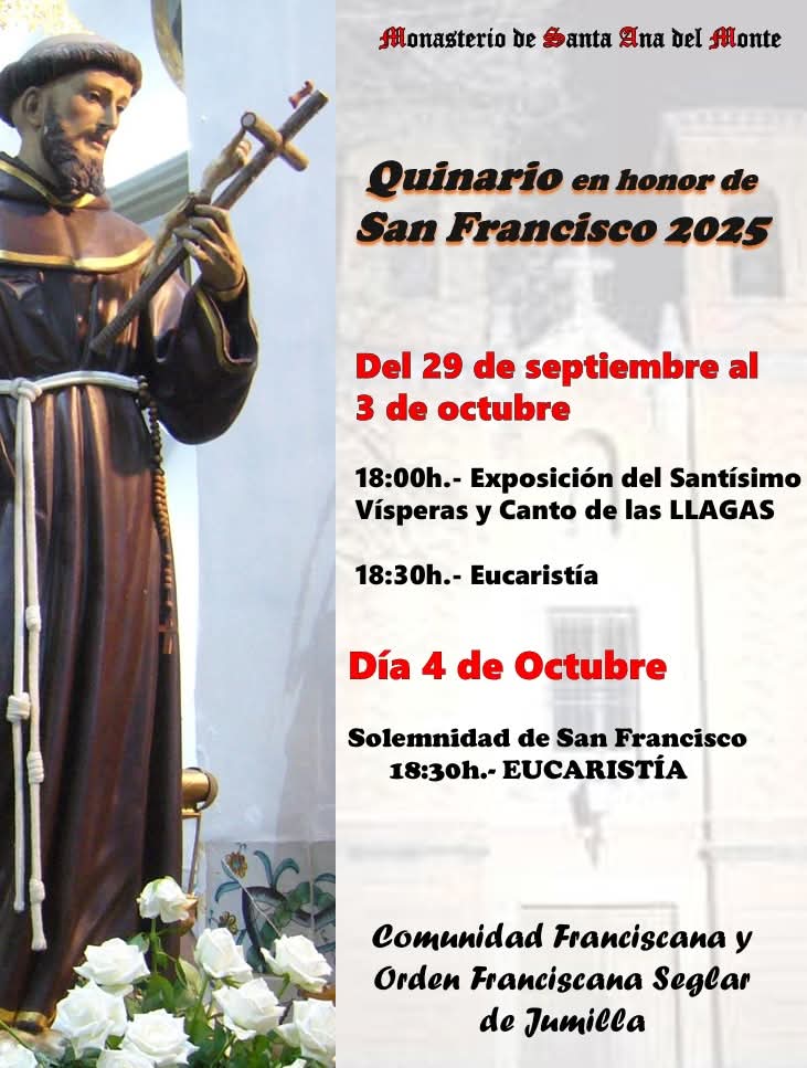 Desde el 29 de septiembre al 3 de octubre, a las 18:00 tendrán la exposición del Santísimo, vísperas y canto de las llagas y después, eucaristía. Ya el 4 de octubre, solemnidad de San Francisco, celebrarán una eucaristía a las 18:30 horas.
