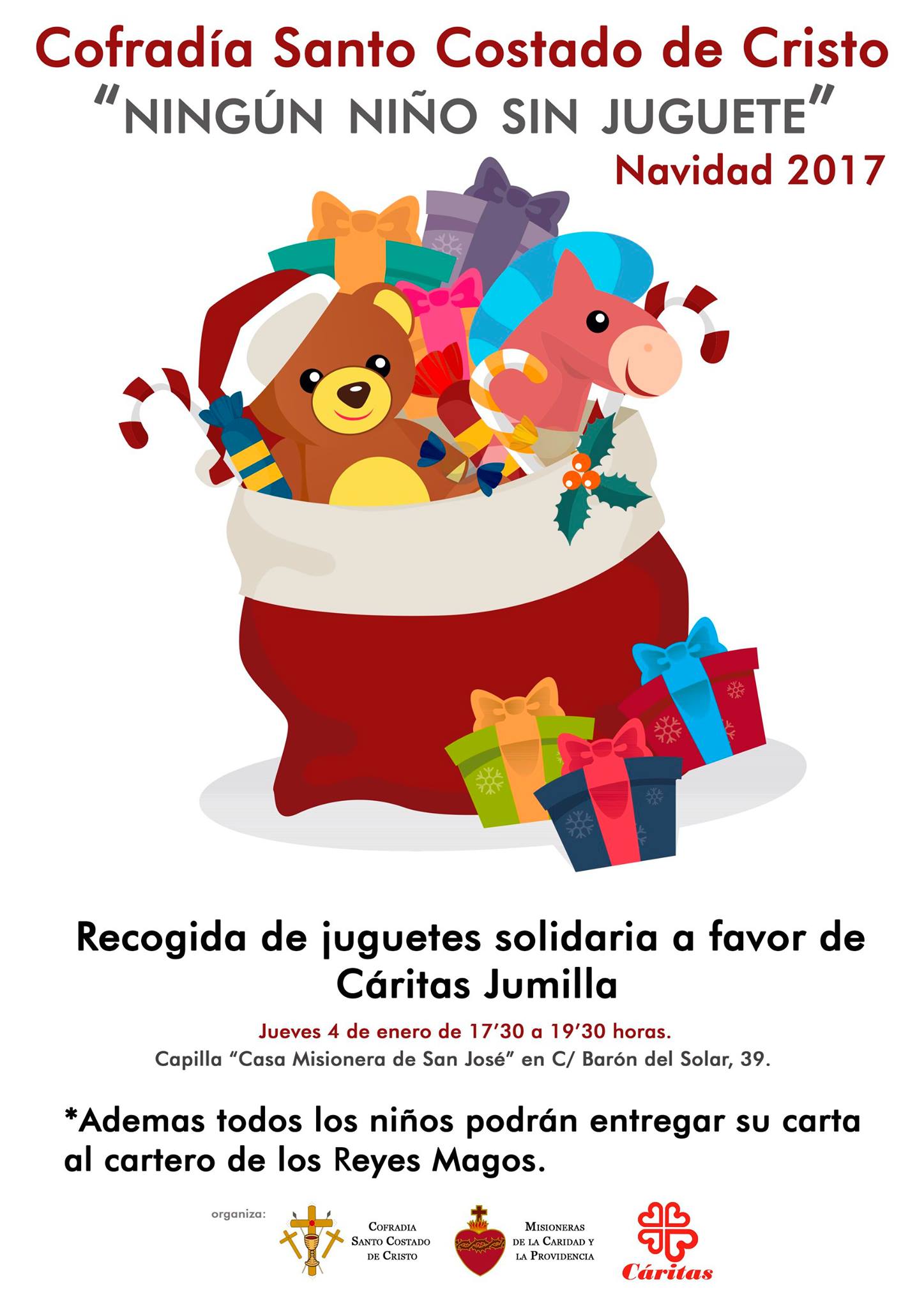 La Cofradía del Santo Costado de Cristo ha organizado una recogida solidaria de juguetes que donará a Caritas Jumilla, bajo el lema “Ningún niño sin juguete”.