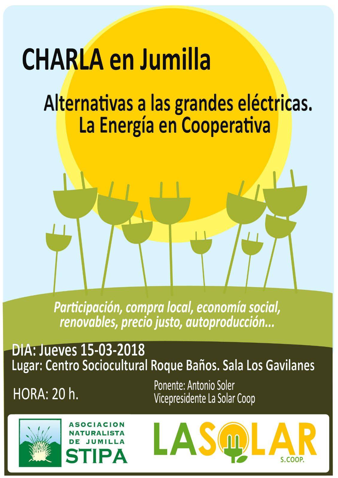 Mañana jueves 15 de marzo, organizada por la Asociación de Naturalistas Stipa de Jumilla, va a tener lugar una charla sobre “Alternativas a las grandes eléctricas. La energía en cooperativa”. La cita será a las ocho de la tarde en el Centro Roque Baños, en la sala Gavilanes.
