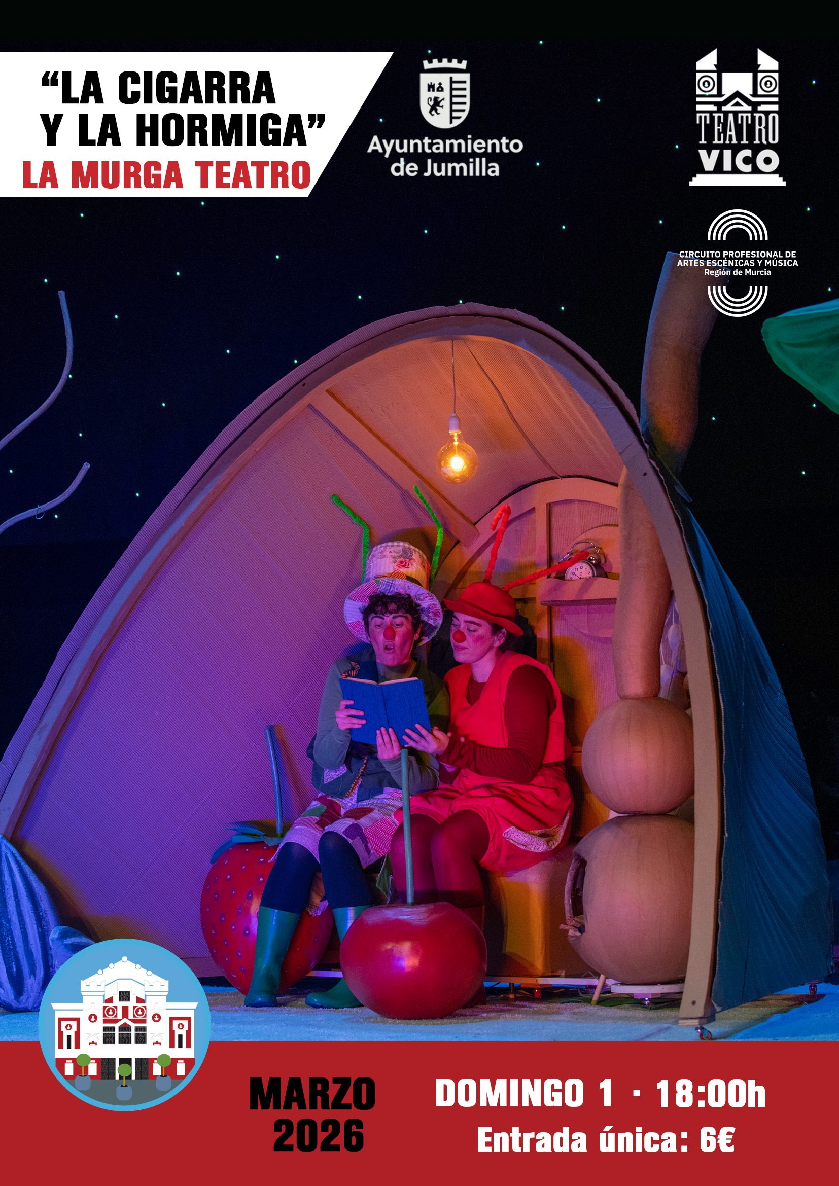 Este domingo 1 de marzo a las 18:00 horas, el Teatro Vico de Jumilla acoge la representación de La cigarra y la hormiga, una propuesta de La Murga Teatro incluida en el Circuito Profesional de Artes Escénicas y Música de la Región de Murcia.