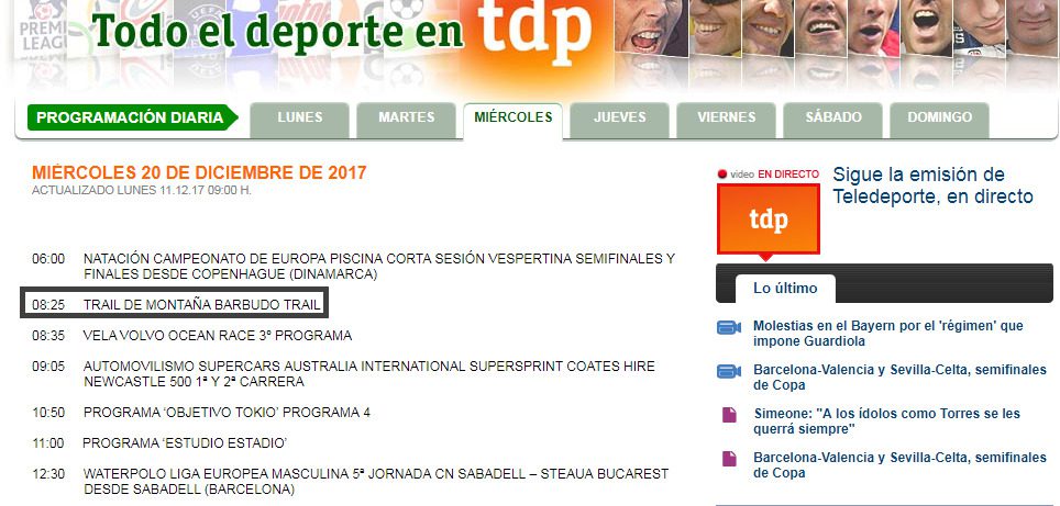 Mañana a las 8:25 horas, en el cadena pública de temática deportiva, Teledeporte, se retransmitirá un reportaje resumen de 10 minutos de la Barbudo Trail 2017 celebrada el pasado domingo 10 de diciembre.