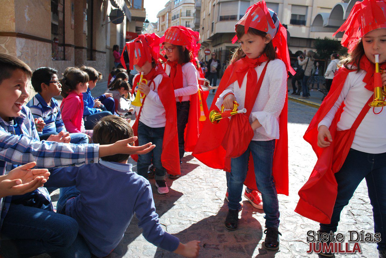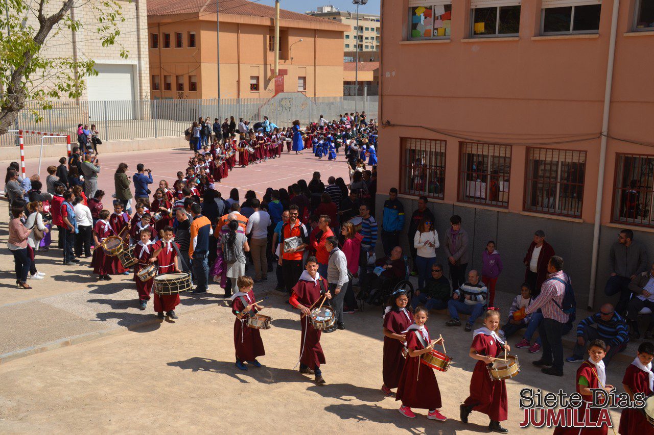 Los niños y niñas de los centros educativos, encabezados por sus maestros, llenaron de color las calles de Jumilla, como preámbulo a la Semana Santa 2017. Además repartieron caramelos entre todos los que se acercaron a ver los desfiles, mayores y pequeños que pudieron disfrutar de los mini capuruchos, armaos, manolas y manolos, tamborileros, bandas de música e incluso Romeros del Cristo, de manos de los colegios, San Francisco, Santa Ana, Nuestra Señora de la Asunción, Mariano Suárez, Miguel Hernández y Carmen Conde.