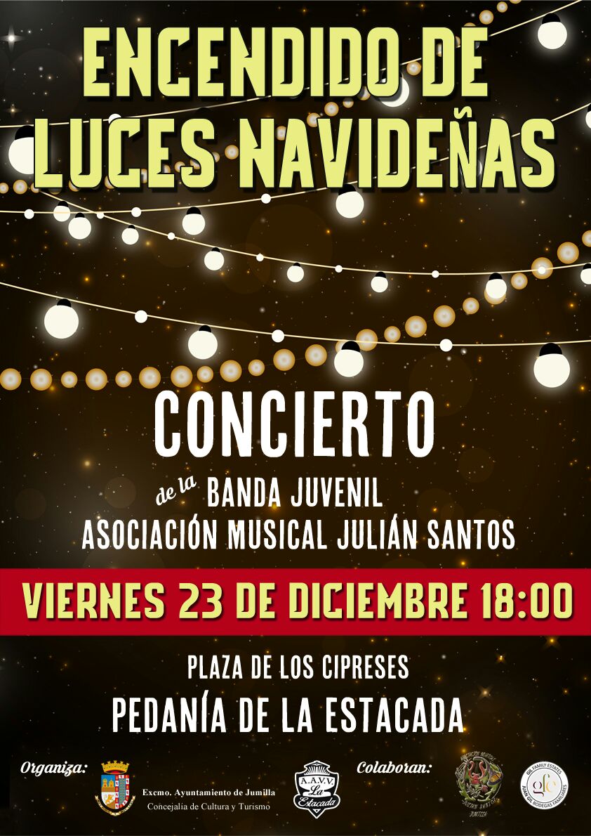 A las 18:00 horas en la pedanía de la Estacada se producirá su particular encendido de luces de Navidad, será en la Plaza de los Cipreses y lo amenizará la Banda Juvenil de la Asociación Musical Julián Santos.