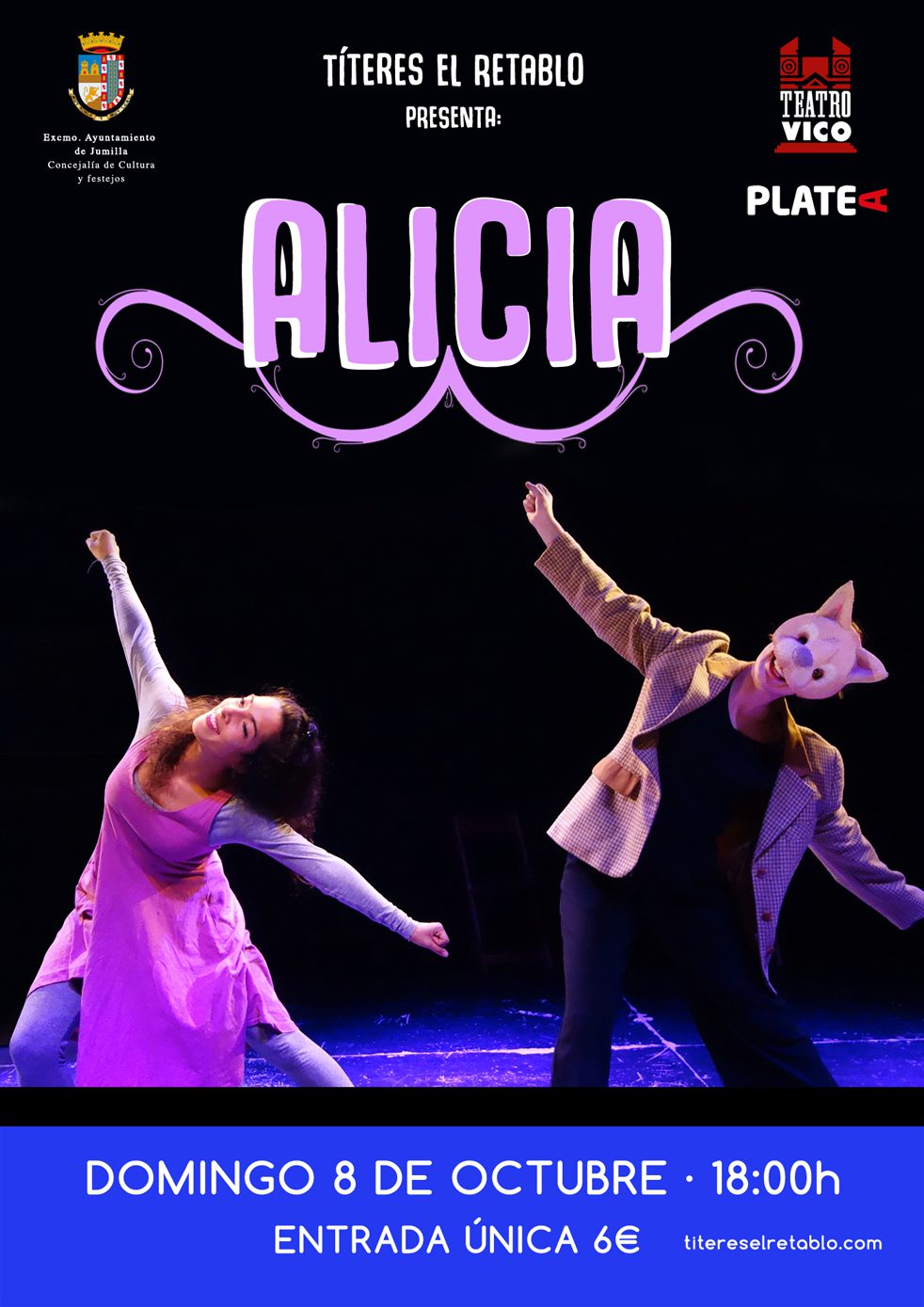Además el domingo, a las seis de la tarde llega ‘Alicia’ de la mano de Títeres el retablo. Es un espectáculo de teatro y danza basado en ‘Alicia en el país de las maravillas’, de Lewis Carrol. Dos actrices escenifican con danzas, máscaras, objetos y otros recursos teatrales el relato inglés. Para asistir a este espectáculo se ha establecido una entrada única de 6 euros.